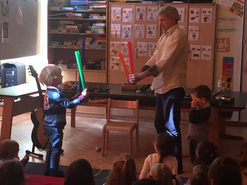 Der Musiker Francois Lemonnier hat mit den Kindergarten- und Schulkindern musiziert. Anschließend durften unsere Schülerinnen und Schüler ihm Fragen auf Französich und Deutsch stellen.