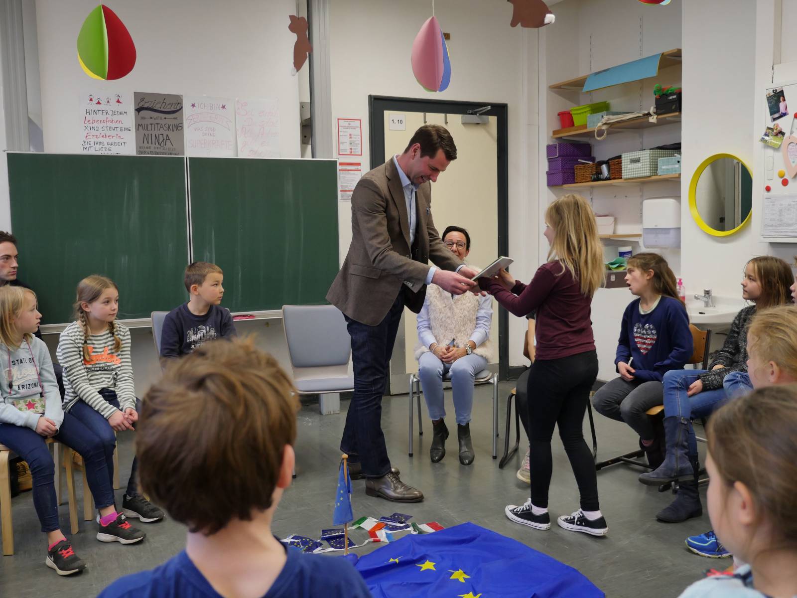 Am bundesweiten Europatag besuchte uns der Politiker Fabian Schrumpf. Einige Dritt- und Viertklässler hatten die Gelegenheit, an einer Gesprächsrunde rund um Europa und Politik im Allgemeinen mit dem Landtagsabgeordneten teilzunehmen.