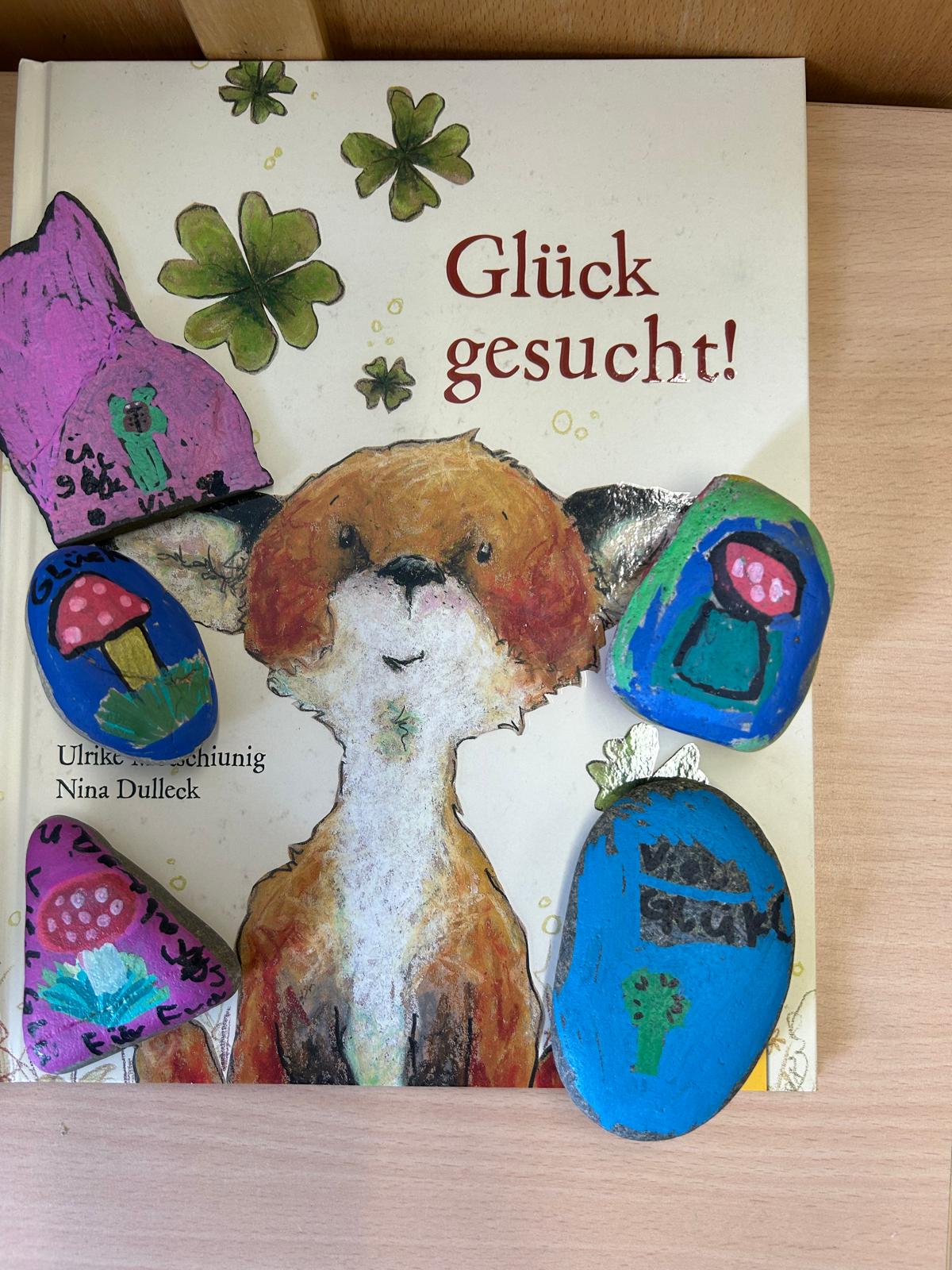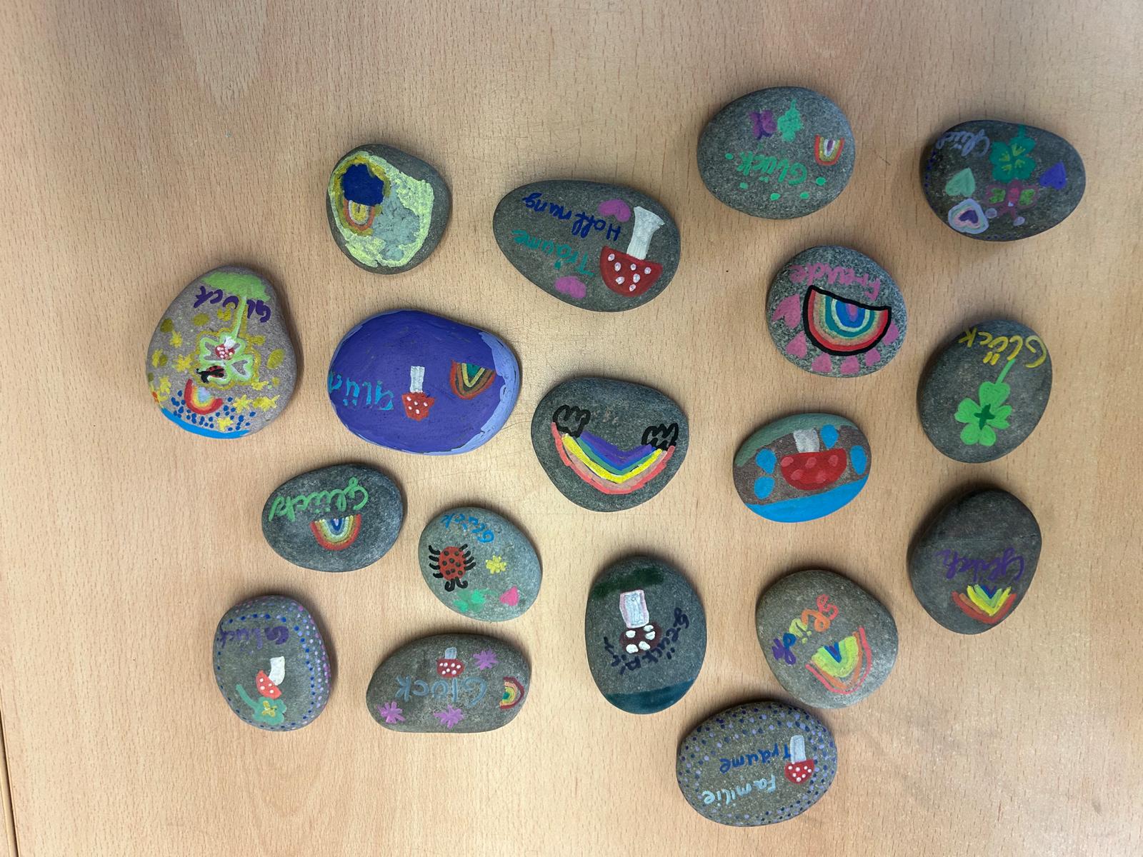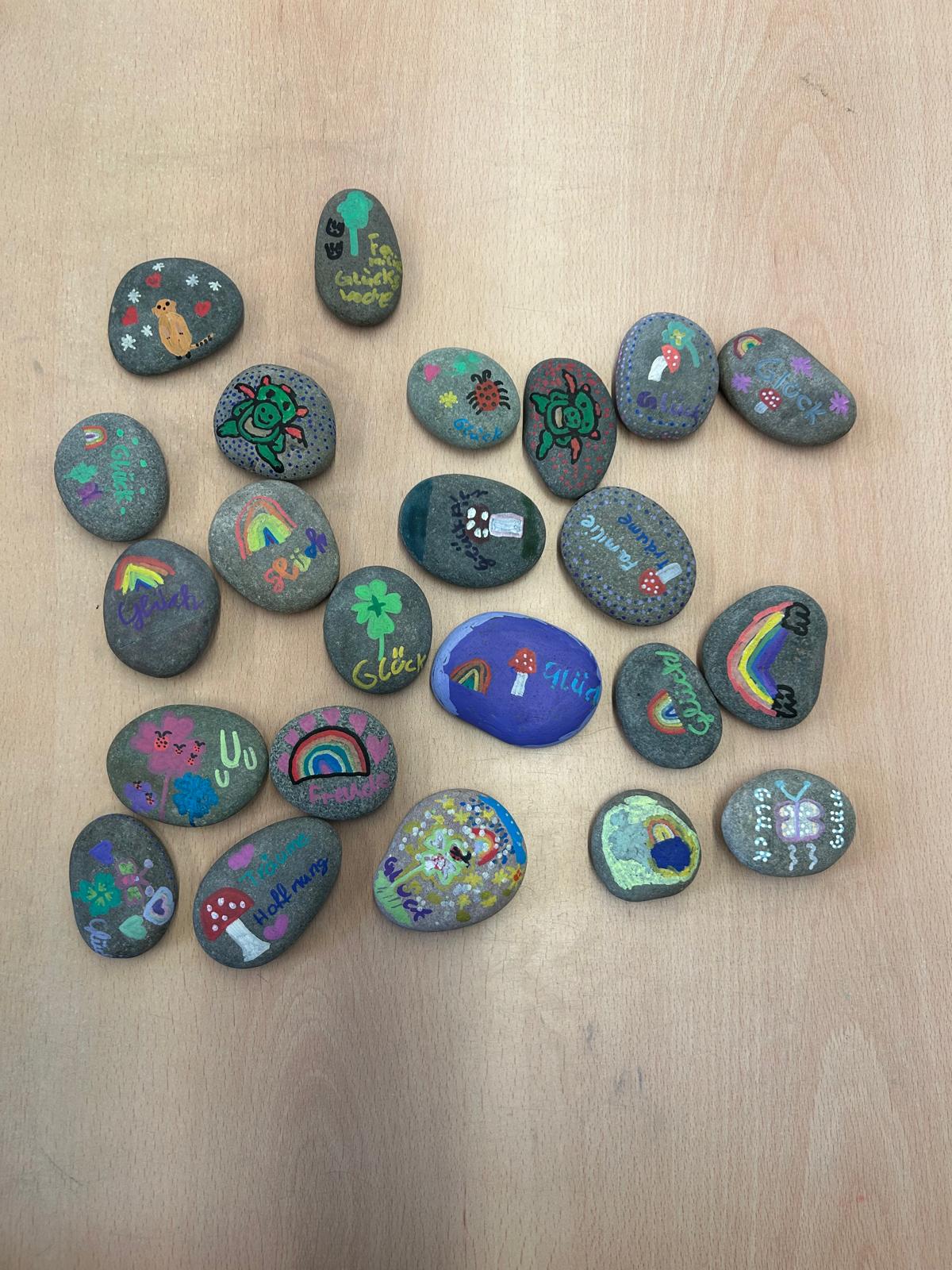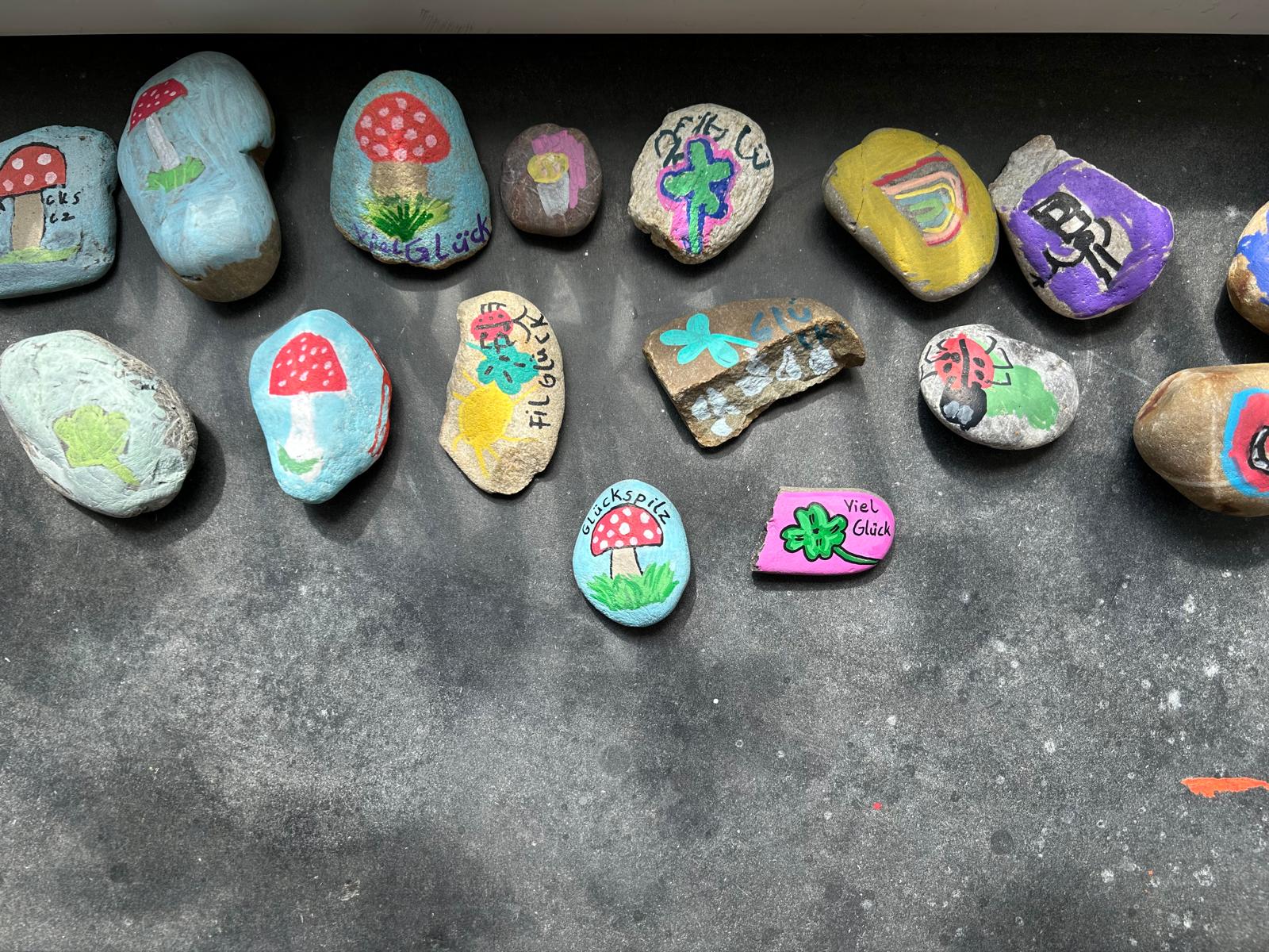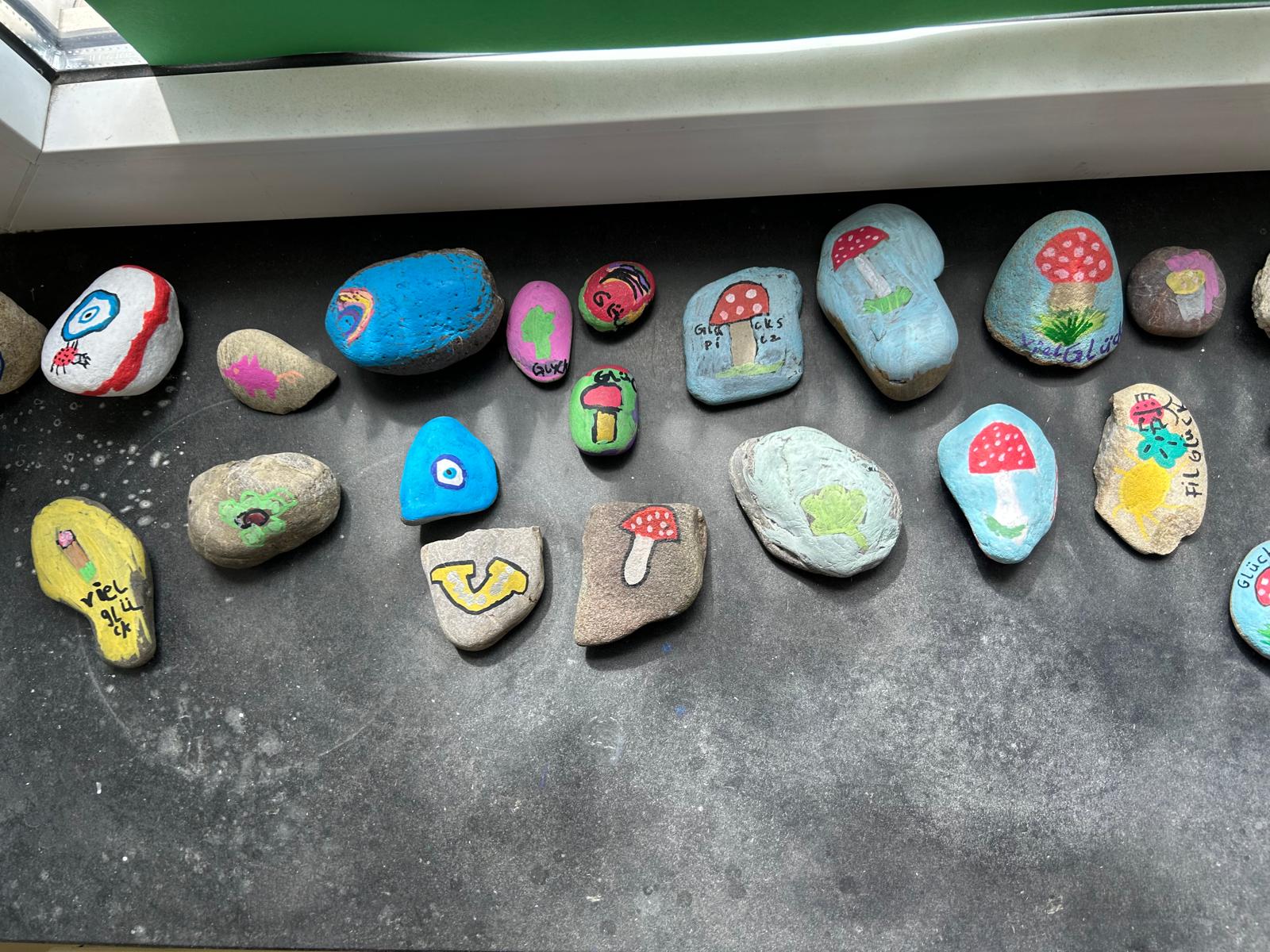 Vom 19.05. bis 23.05. 2025 fand an der Georgschule eine Projektwoche zum Thema Glück statt. In den Klassen fanden viele ganz unterschiedliche Aktionen statt, z.B. wurden Glückssteine bemalt, verschenkt und in Heisingen ausgelegt, Bilderbücher vorgelesen, Stop-Motion-Glücksfilme gedreht, getanzt, gebastelt, Spielplätze besucht, Glücksbingo gespielt, es gab „warme Duschen“, nette Worte, Picknicks, Eis, keine Hausaufgaben und ganz, ganz viel GLÜCK.