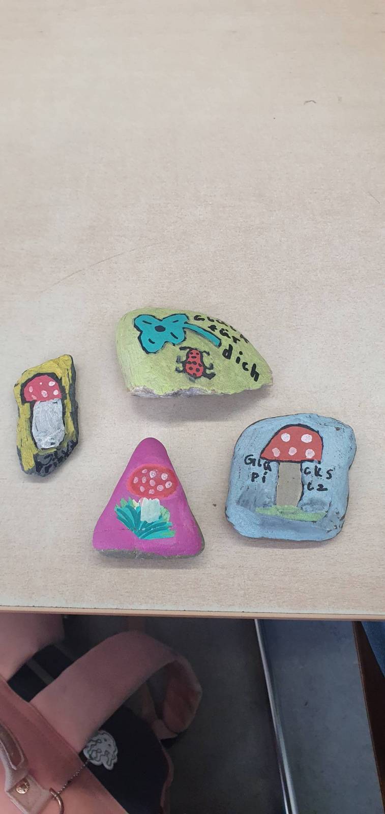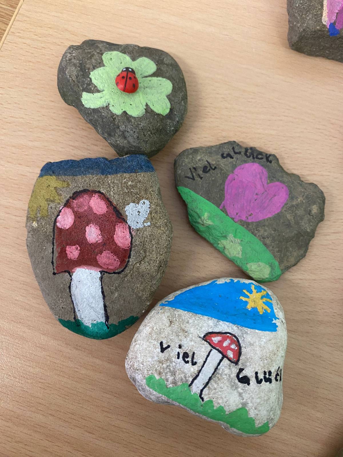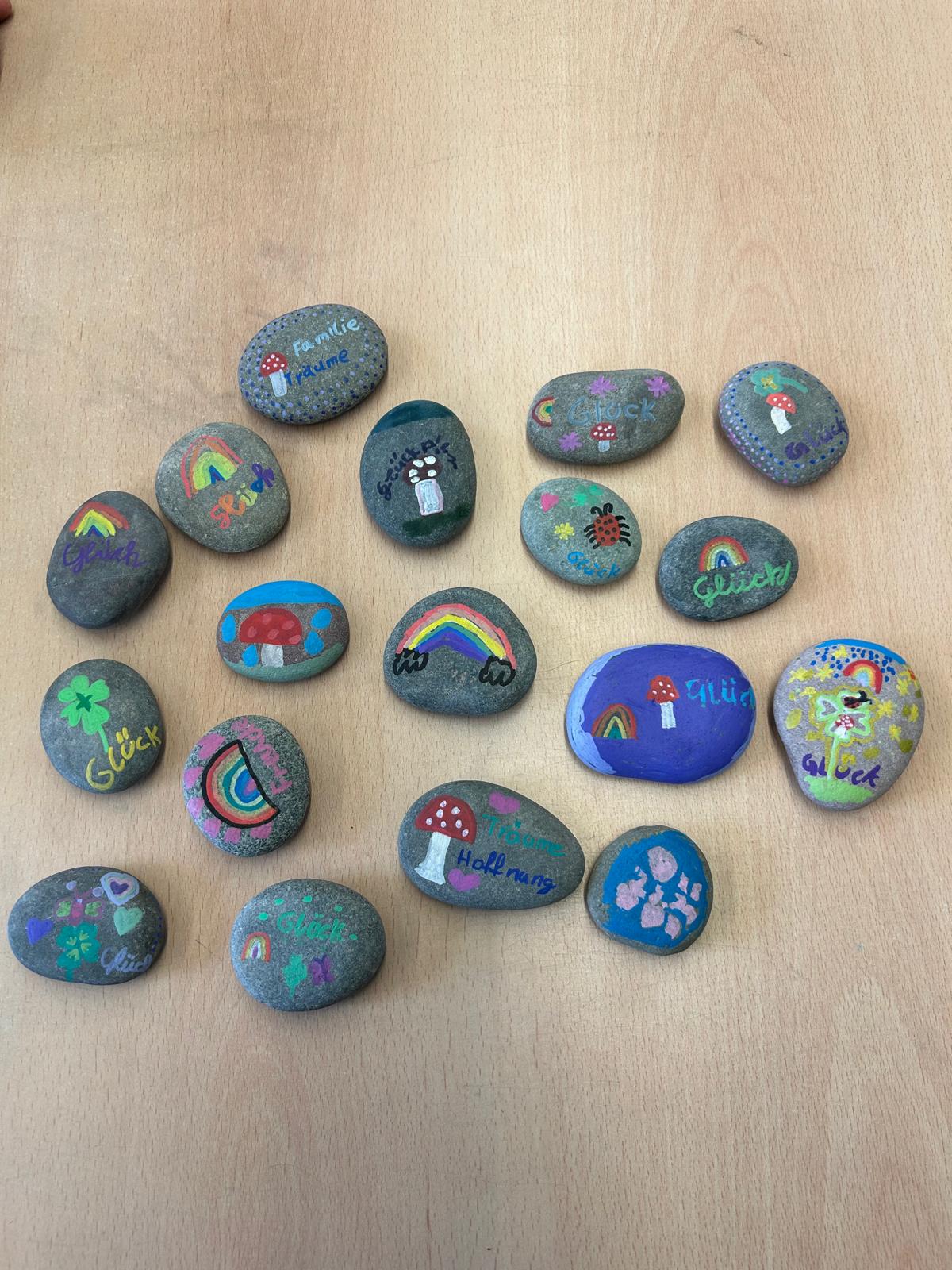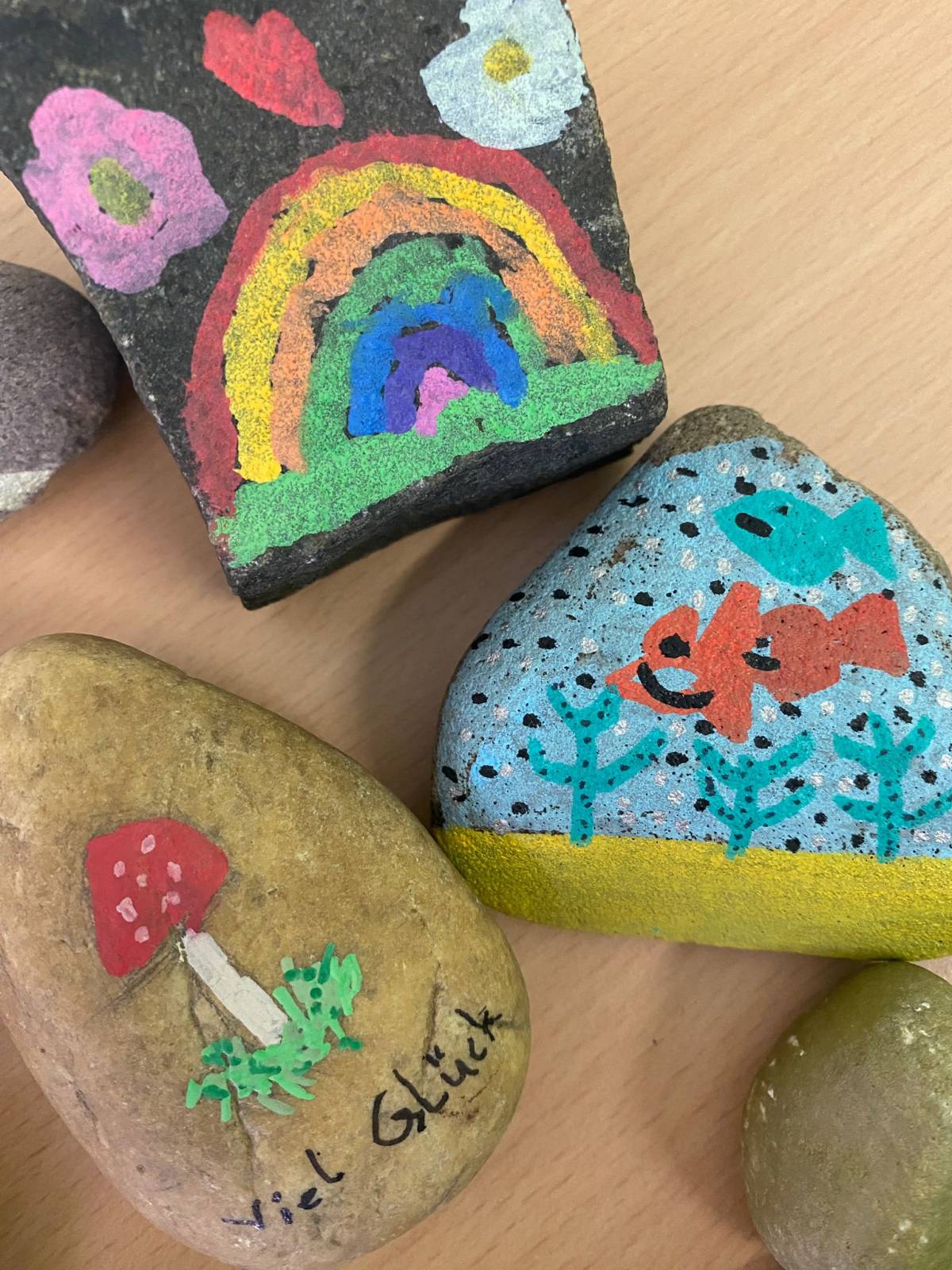 Vom 19.05. bis 23.05. 2025 fand an der Georgschule eine Projektwoche zum Thema Glück statt. In den Klassen fanden viele ganz unterschiedliche Aktionen statt, z.B. wurden Glückssteine bemalt, verschenkt und in Heisingen ausgelegt, Bilderbücher vorgelesen, Stop-Motion-Glücksfilme gedreht, getanzt, gebastelt, Spielplätze besucht, Glücksbingo gespielt, es gab „warme Duschen“, nette Worte, Picknicks, Eis, keine Hausaufgaben und ganz, ganz viel GLÜCK.